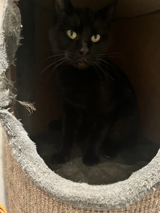 Silkebløde My er en lidt forsigtig dame der har boet hos en enlig dame. Hun skal lige falde til eller overtales med lidt Dreamies (dem elsker hun nemlig!) før hun kommer ud af sin skal. Men så er hun også rigtig kælen. Sorte katte kan være lidt svære at tage billeder af, men hun er en meget smuk panter af en kat med den blødeste pels. My har tidligere boet sammen med to hunde.