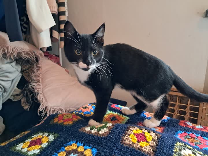 Han startede livet i et haveskur sammen med sine tre søskende og en hengiven, menneskesøgende kattemor. Da killingerne blev større, førte moren dem trygt videre til plejefamiliens udestue og senere til sundhedstjek hos Dyrenes Beskyttelse i Brande, før de kom tilbage til familiepleje.