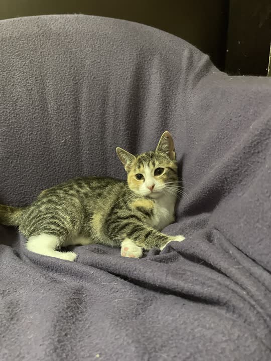 Aymee er vokset op i et roligt hjem på landet sammen med sin bror og to andre killinger. Hun er en forsigtig pige, der tager livet i sit eget tempo. Hun kan godt lide at lege med de andre katte, men trækker sig gerne tilbage til sin “base”, når der sker for meget. Lige nu er hendes favoritplads en køkkenstol tæt på sin trygge krog, hvor hun hurtigt kan føle sig sikker.