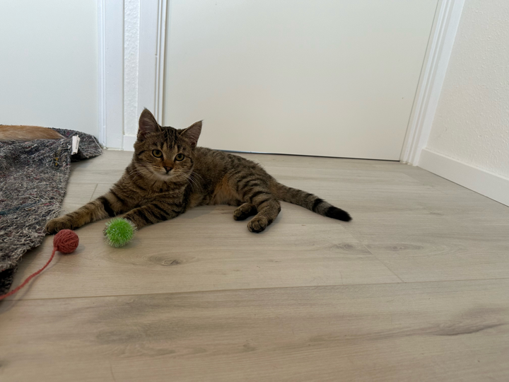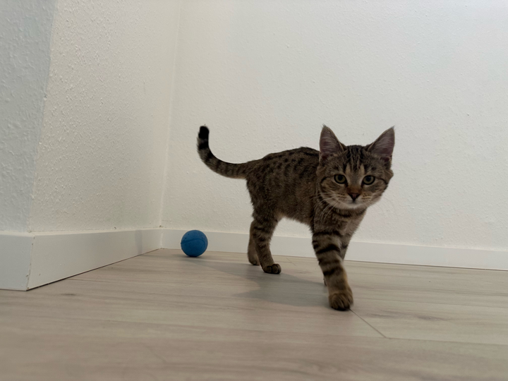 Hun er typen, der elsker at være midt i det hele. Lige nu kigger hun måske nysgerrigt på skærmen, og i næste sekund spurter hun afsted efter en anden killing med et stykke legetøj – præcis sådan er Nala. 😄