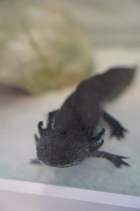 De kan leve alene eller sammen med en anden axolotl af samme køn – en han og en hun vil ellers lægge mange æg. Vi holder i øjeblikket øje med, om vores ene hun kan have æg i sig efter at have boet med en han i sit tidligere hjem.