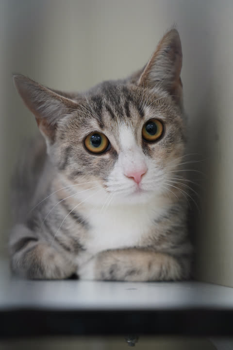 Sascha blev fundet efterladt i en transportkasse ved en landevej – dumpet og helt alene. Da hun kom til os, var hun meget skræmt og bange, og hun har vist sig at være en stille og lidt tilbageholdende kat. Det er helt forståeligt med alt det, hun har været igennem.