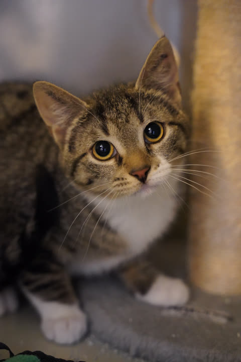 Caroline har været i pleje sammen med Cirkeline. Hun er en kærlig kat, som i starten kan være lidt forsigtig og utryg og derfor har brug for tålmodighed og rolige rammer. Caroline skal have lov til selv at tage initiativet og komme til én i sit eget tempo.