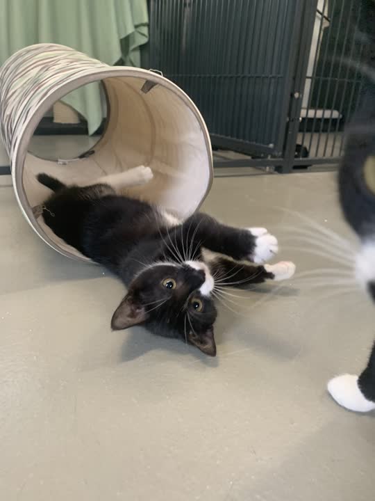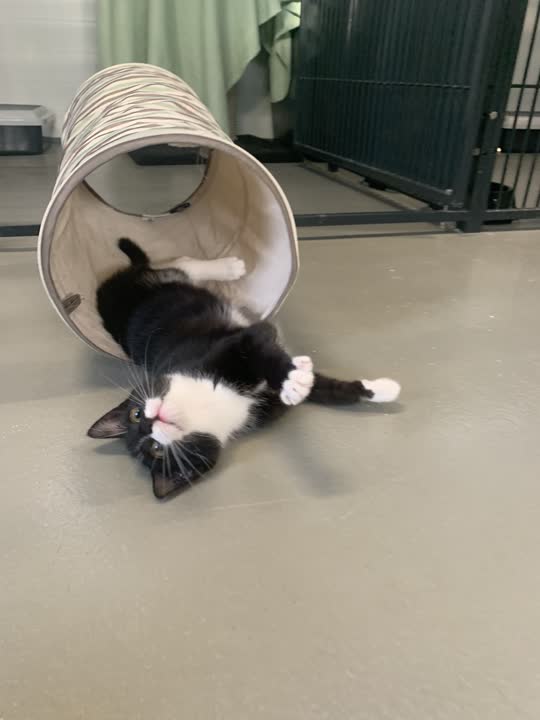Tin er en sød og legesyg killing. Tin skal på sigt kunne komme ud og få græs imellem poterne og vind i pelsen.