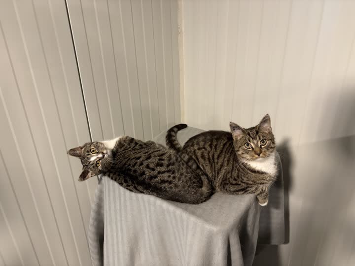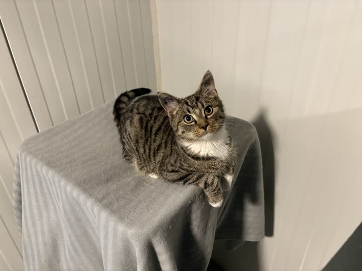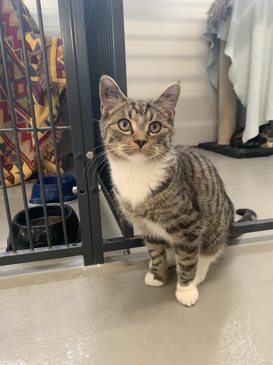 Snurre blev fundet dumpet på en rasteplads med sin bror Stribe. De er et par nysgerrige og kælne killinger. Snurre skal på sigt kunne komme ud.