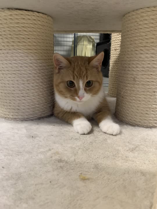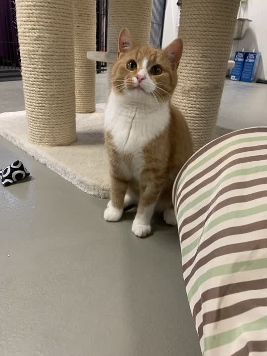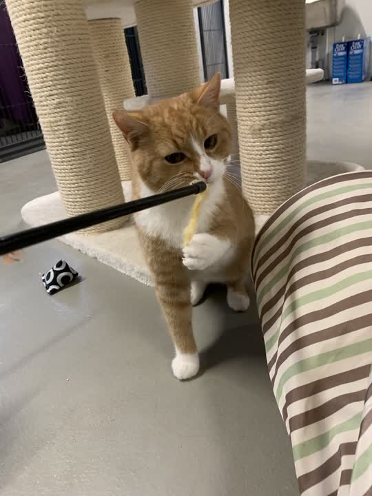 Kalmer er en lidt forsigtigt dreng. Han spiller op til leg overfor de andre katte, og løber også gerne efter en drillepind. Han skal ud i et roligt hjem, hvor han får tid til at lande stille og roligt. kalmer skal på sigt have mulighed for at komme ud.