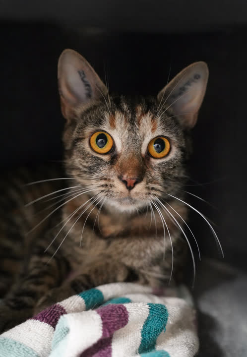 Meta på 3-år blev fundet alene med sine to killinger. Meta var allerede der meget tam og kælen, og har været en fornøjelse at have i pleje. Killingerne er nu fløjet fra reden, og nu er mor-Meta klar til selv at finde sit nye hjem. Hun er til den stille og rolig sidde, og kan godt være en smule genert ved første møde. Hun skal lige vænne sig til nye omgivelser og mennesker. Hun har endnu ikke mødt hunde, og andre katte kan godt være ok.