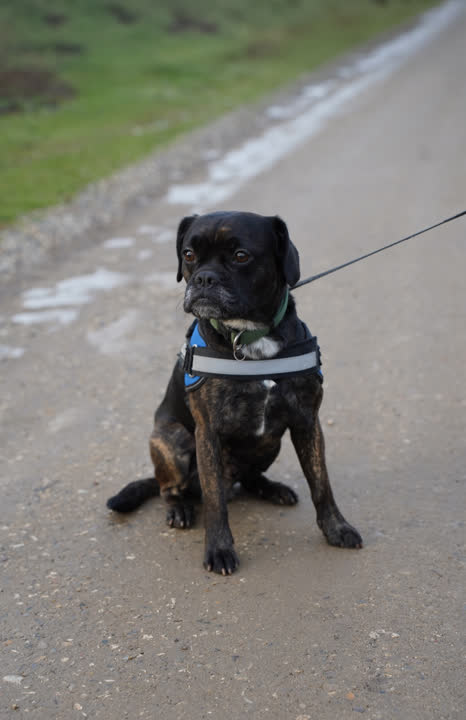 Han har aldrig været alene hjemme uden en anden hund eller andre hjemme. Og hans tidligere ejer arbejdede som dagplejemor, har han generelt ikke haft erfaring med at være alene hjemme. I hjemmet kan han finde på at være destruktiv, men han finder stor tryghed i sit bur. Han er en modig hund, som ikke virker bange for noget, men han er til gengæld en ægte udbryderkonge og kan både grave sig ud af haven og hoppe over hegn. Han har ikke gået til egentlig træning, men kan signalerne sit, put dig, uden om og vent.