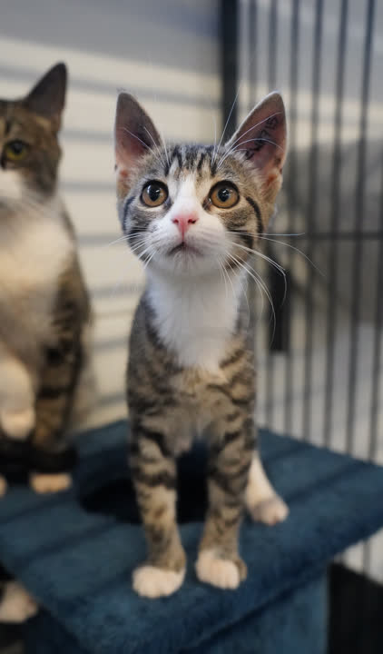 Lille Nour på 3 måneder er en nysgerrig killing, der gerne stikke sin snude i spændende ting. Nour vil gerne hilse, og fungerer umiddelbart fint med de andre killinger. Vi ved ikke med hund