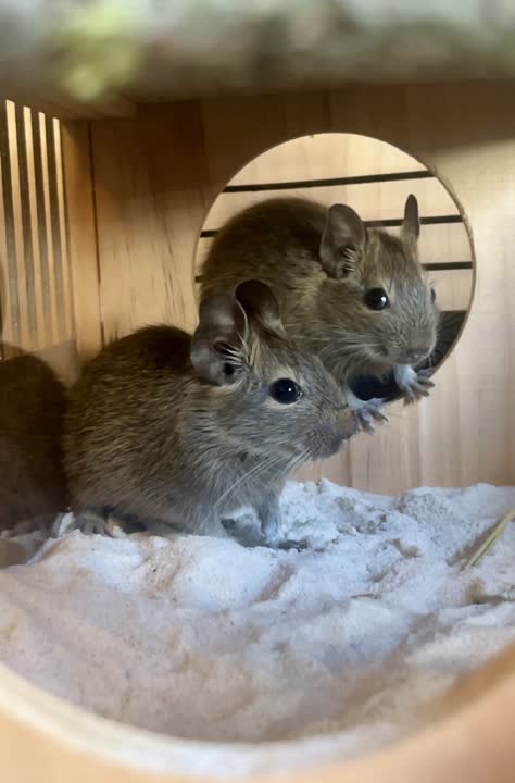 Bemærk: Disse små degu-unger blev fundet som 4-ugers unger uden mor og far. Derfor bliver de adopteret ud nu.