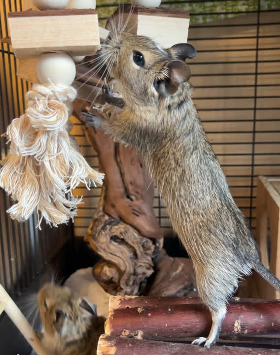- Kræver et stort bur/voliere – Hvis alle 4 deguer skal holdes sammen er der et krav om et indendørs voliere på omkring 200 cm x 60 cm i grundmål, og mindst 100–120 cm højt med etager og platforme. Jo mere plads og flere etager = jo færre konflikter og gladere dyr.