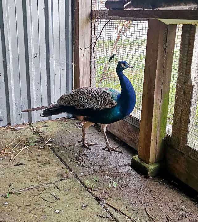 -En stor og sikret voliere, egnet til at huse påfugle – gerne med mulighed for både skygge, sol og læ.