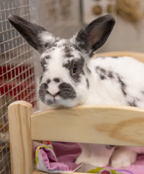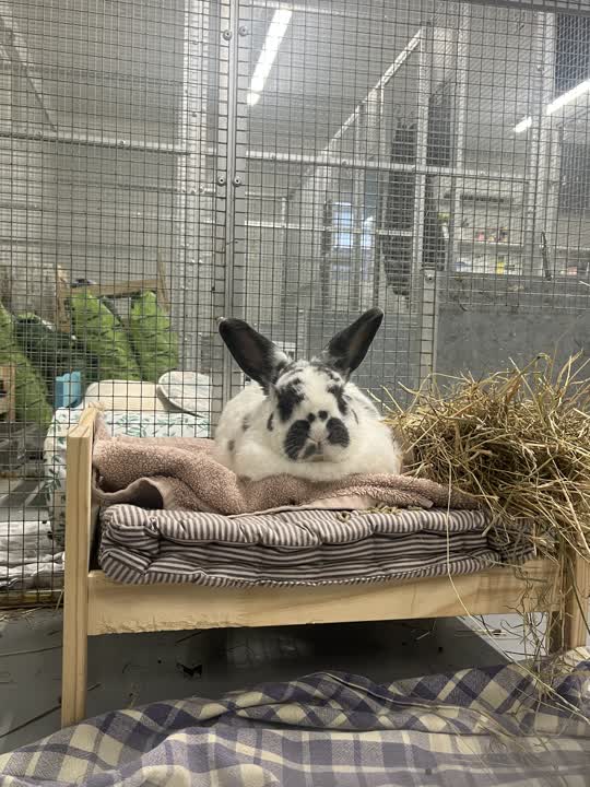 - Skal bo som frikanin indenfor (uden bur) i et kaninsikret hjem, med fokus på et blødt underlag.