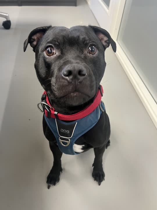 Simba er en skøn Staffordshire bull terrier-han på 1 år og 8 måneder. Han er en super venlig og kontaktsøgende hund, som knytter sig tæt til sine mennesker og sætter stor pris på fysisk nærhed. Han er en l