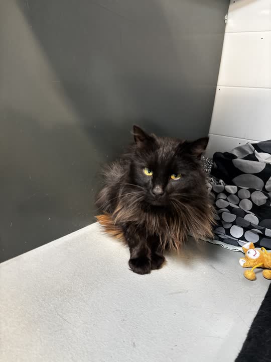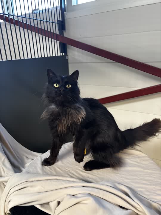 Nudgez er en skøn langhåret hankat født den 15. april 2024 🐾 Han er kastreret og vejer 4,1 kg – en flot fyr med en blød sort lang pels 🖤