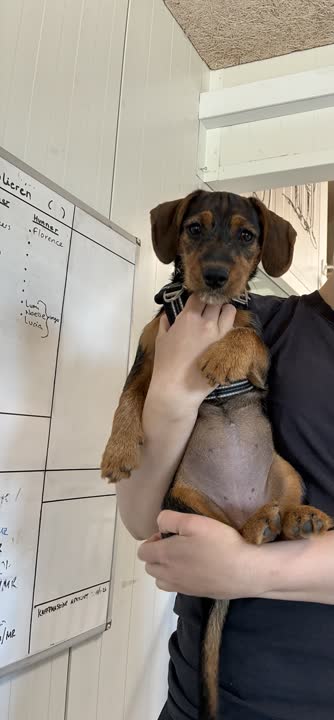 Hun er stadig ved at lære de basale ting i livet. At gå i snor er nyt for hende, men hun har allerede gjort fine fremskridt under sit ophold her på internatet. Derudover skal hun lære at være alene hjemme helt fra bunden, samt alt det øvrige, man kan forvente af en hvalp.