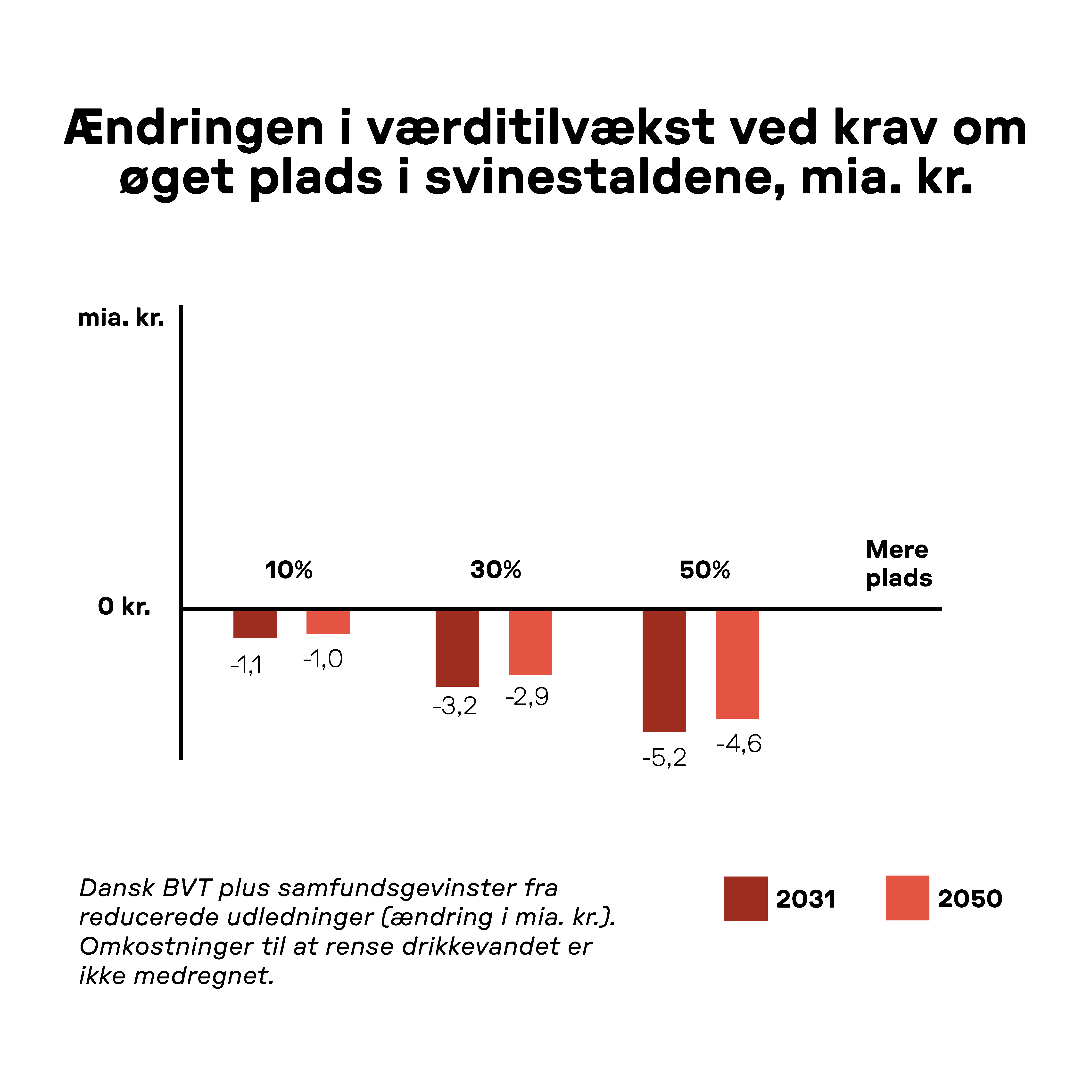I dag har en dansk gris på op til 110 kilo krav på 0,65 kvadratmeter. Hæver man pladskravene med 50 procent, så vil danske grise derfor få omkring én kvadratmeter. Det matcher kravene i f.eks. den svenske svineproduktion, hvor dyrevelfærden er betydeligt højere.