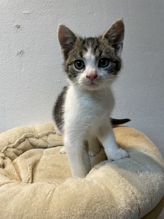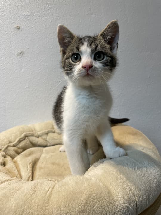 D-14288. Sød og nysgerrig hankilling i gråstribet/hvid fundet.