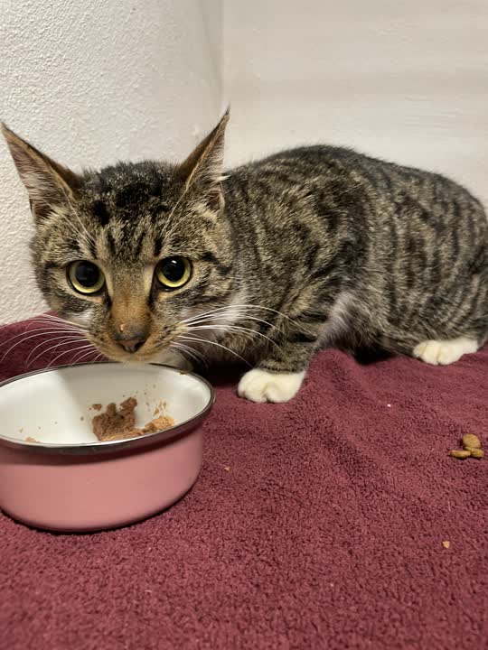 D-15389. Nervøs, men mild hankat i gråstribet m. hvid fundet.