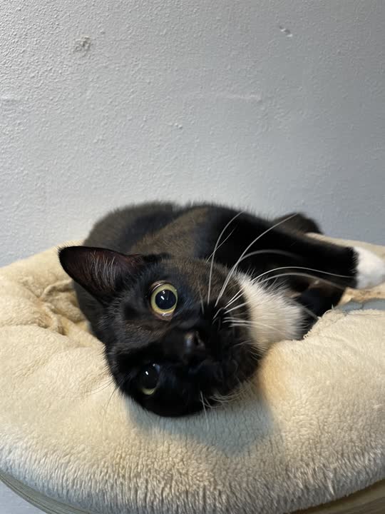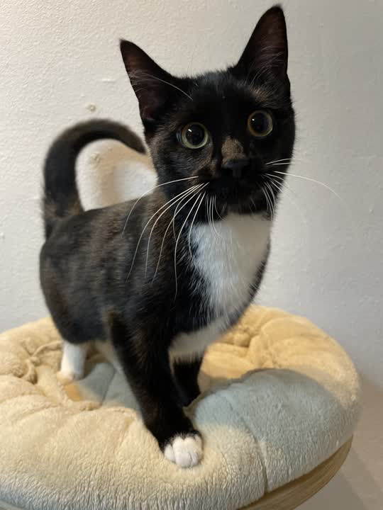 D-15408. Meget sød, snakkende og opsøgende sort/hvid hunkat fundet.
