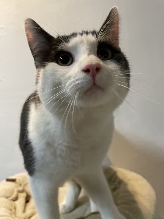 D-15477. Grå/hvid hankat fundet. Menneskevant.