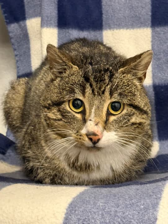 D-15530. Gråstribet kat med hvid fundet. Skræmt og med tilskadekommet hale.