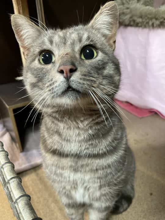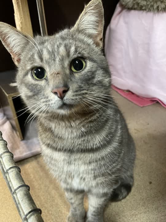 D-15738. Sød og rolig hankat i lys gråstrib fundet med småskrammer.