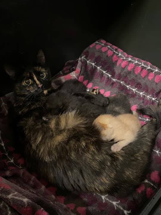 D-17325. Missemor i mørke trefarvede nuancer er fundet med sine 5 killinger.