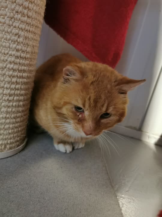 Rød hankat fundet på egne poter, med lidt skrammer. Sidder på Fyns Internat med opholds nr D-17457