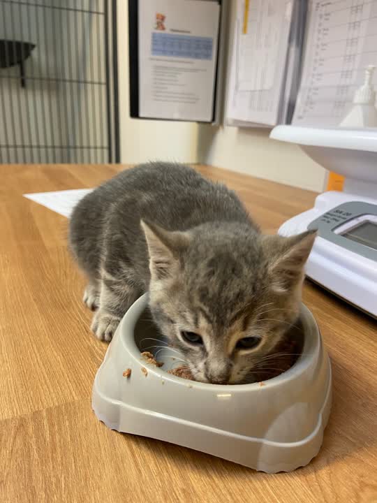 En lille gråstribet hunkilling på ca. 5 uger, fundet på egen pote, meget sulten og desperat for kontakt. Kender du til denne, kontakt os på Roskilde internat og oplys sagsnummer: D-13928